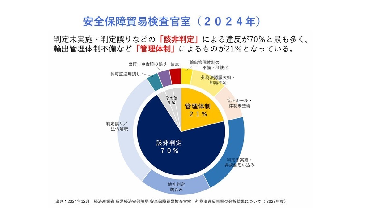 経済産業省が公表している最近の税関での違反原因分析(下図)では、全体の70%が該非判定に起因するものとなっています。